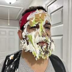 Quietman was surprised by JimT777 with a big sloppy cream pie to the face